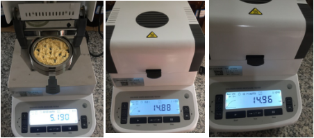 測試樣品2:為了檢測儀器的精確性,待儀器溫度降至50℃以下時進行第二次測試,用實驗勺提取5.5克飼料,置于不銹鋼托盤中,用實驗藥勺將飼料平鋪均勻,溫度設置135℃用儀器進行加熱,約15分鐘后檢測結束,檢測數據顯示14.88%;