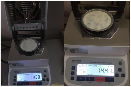 測試樣品:取5克大米,用粉碎機打成粉末狀,置于不銹鋼托盤中平鋪均勻,溫度設(shè)置120℃用儀器進行加熱,約12分鐘后檢測結(jié)束,檢測數(shù)據(jù)顯示14.38%;