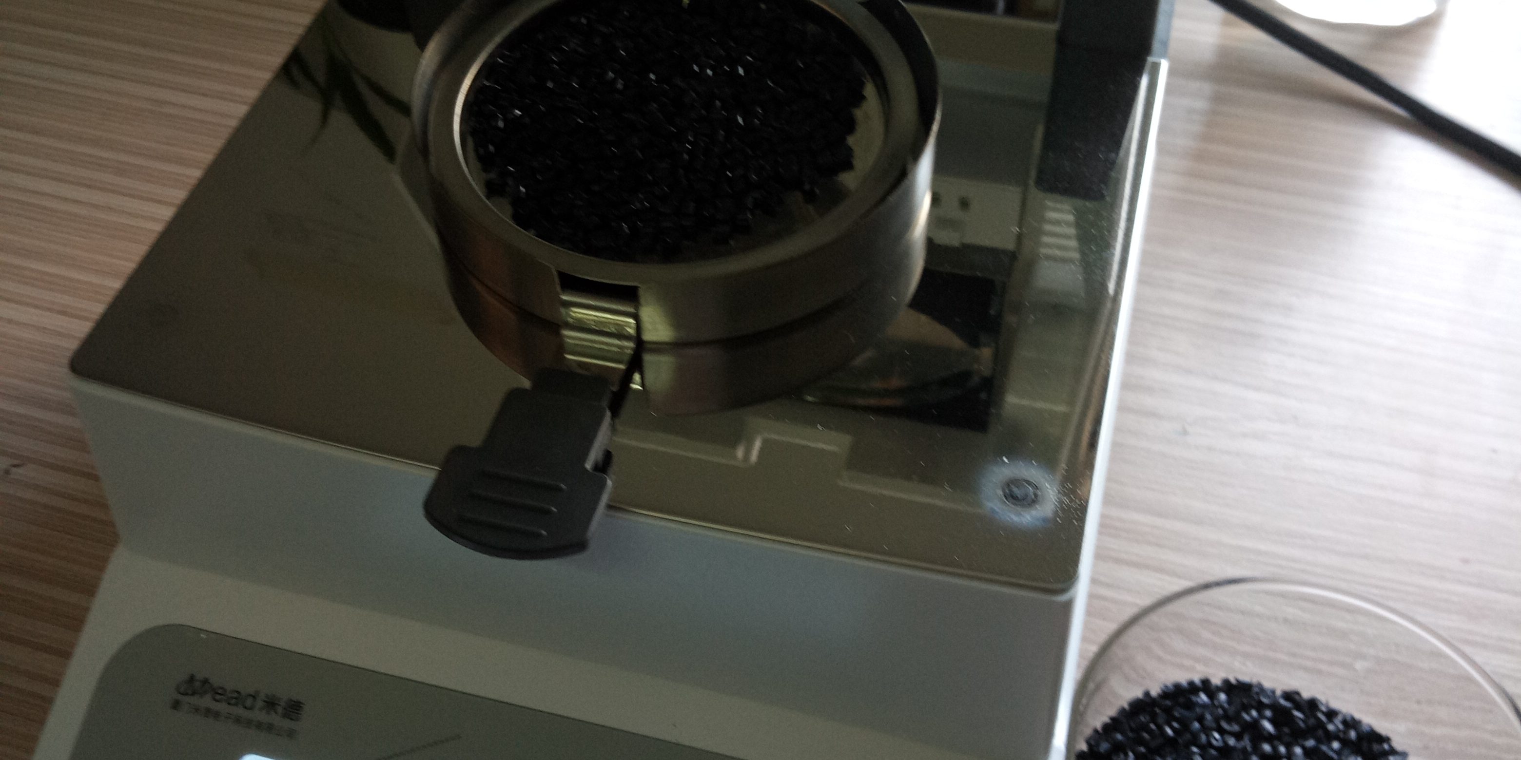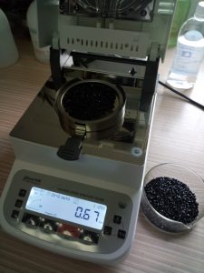 • 測(cè)試再生尼龍顆粒:倒出8克左右再生尼龍料顆粒倒在不銹鋼托盤(pán)中,為了使測(cè)試過(guò)程中再生尼龍水分儀將再生尼龍料烘干烘透,我們將尼龍顆粒攤成分散狀,以便溫度能滲透進(jìn)再生尼龍內(nèi)部。用鑷子將再生尼龍顆粒平鋪均勻,為避免尼龍顆粒烘烤后變焦變黑,我們將溫度設(shè)置在125℃,按“START”鍵開(kāi)始測(cè)試,5分40秒后檢測(cè)結(jié)束,檢測(cè)數(shù)據(jù)顯示0.67%;