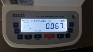測試樣品3:為了檢測儀器的精確性,待儀器溫度降至30℃(常溫)以下時進(jìn)行第二次測量,用藥匙取樣10-12g,用藥匙取樣10-12g纖維紙上,溫度設(shè)置85℃用儀器進(jìn)行加熱,約3分鐘后檢測結(jié)束,檢測數(shù)據(jù)顯示0.067%;